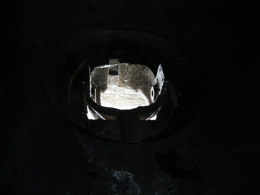 Ещё несколько снимков этого дота. Нижний ярус привычно завален камнем. Хорошо видно отверстие для перископа в бронеколпаке. И мощная задвижка на бронедвери.