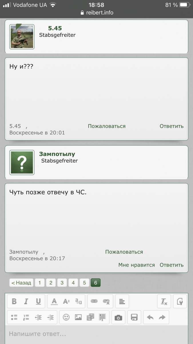 КАМРАД Yarik_jar _Підтримую а такі як ((Зампотылу)) і дійсності продають брак,а потім ні вибачень ні обмін товару ні повернення коштів,нічого,я вже писав а у відповідь тишина або взагалі не по темі,через його ,,рукоблудство,.можна залишитись калікою,модератор ще досі не прийняв рішення,дивно.....? Ще раз скидую посилання на переписку із ((Зампотылу)).. https://reibert.info/conversations/...arabin-mosina.4343229/page-2#message-22767464