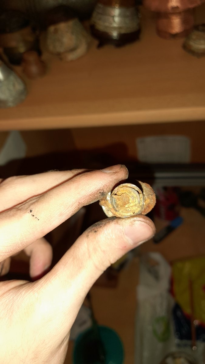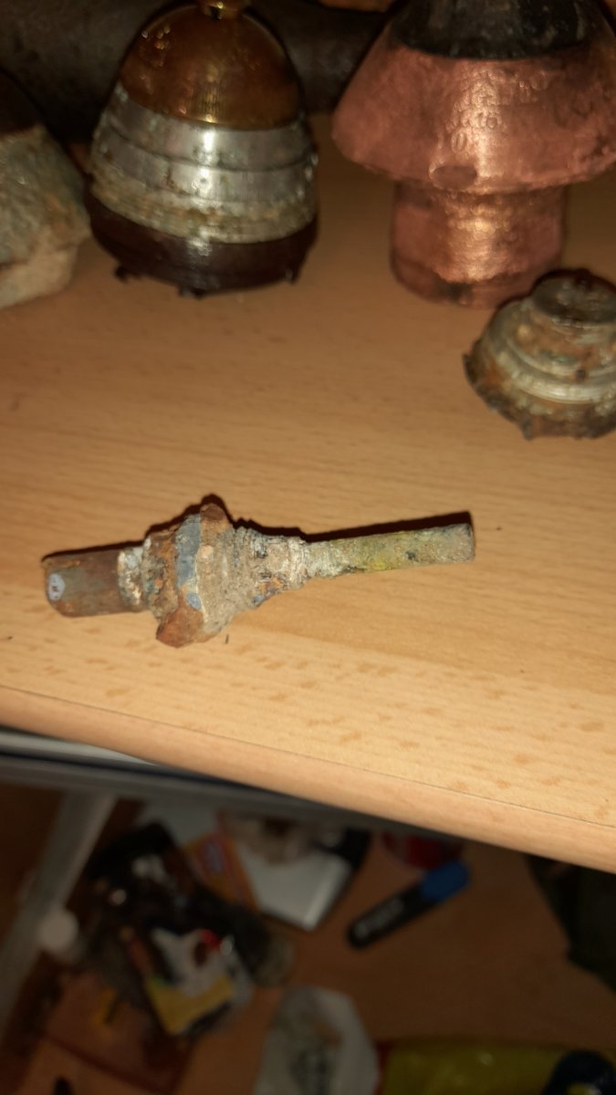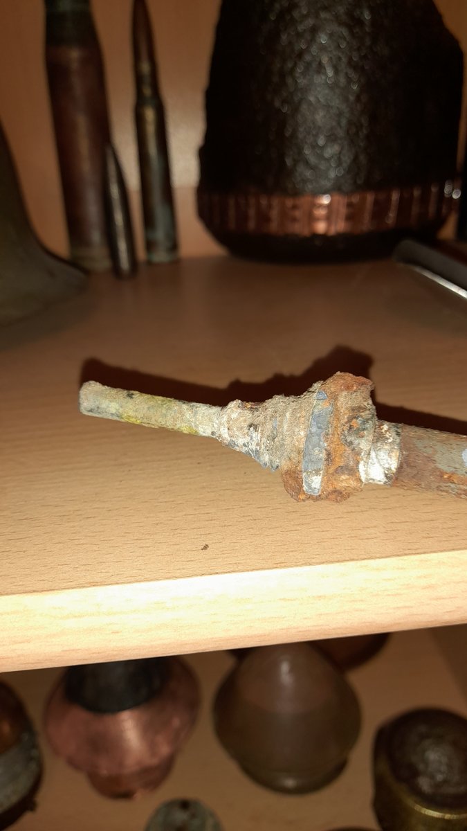 Вечер/день/утро доброе господа , нашёл вот такую шнягу на позиции пмв валялась у меня какое-то время щас часть больно похожая на детон покрылась желтезной , пикринка? Не знаю , если знаете напишите заранее благодарен с ув.