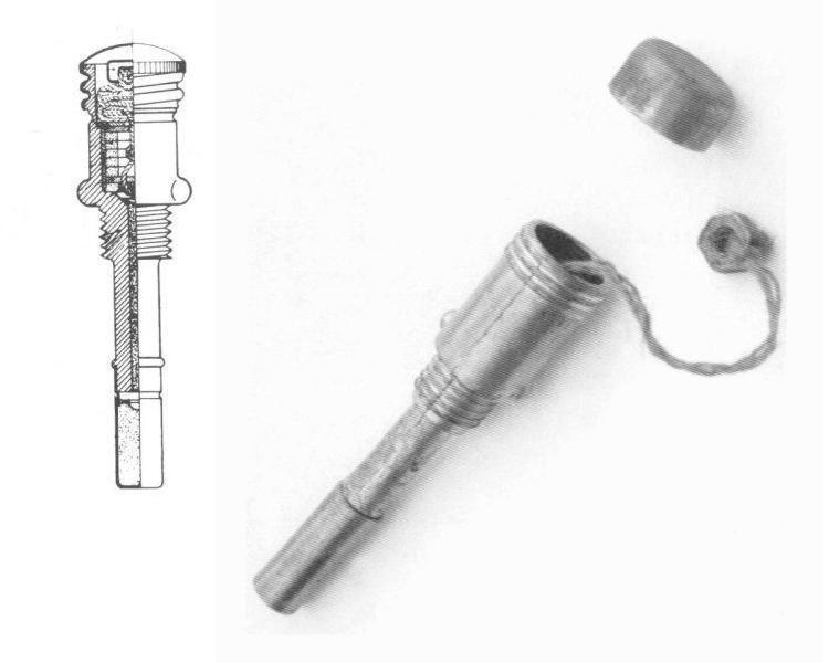 Не-а-а-а...Не он! Посмотрите на корпус НЕМЕЦКОГО и найденного терочного запала. Видите у НЕМЦА ОБЖАТИЕ ("вдавливание") внешнего корпуса? В-о-о-от.....! А ТС ПОЛЬСКИЙ (видите ВЫСТУПАЮЩИЕ РЕБРА) на ВМВ терочный запал. Названия у меня его нет. Но вот фото и схема имеются. Кстати применялся поляками на самодельных гранатах, используемых в Варшавском восстании.