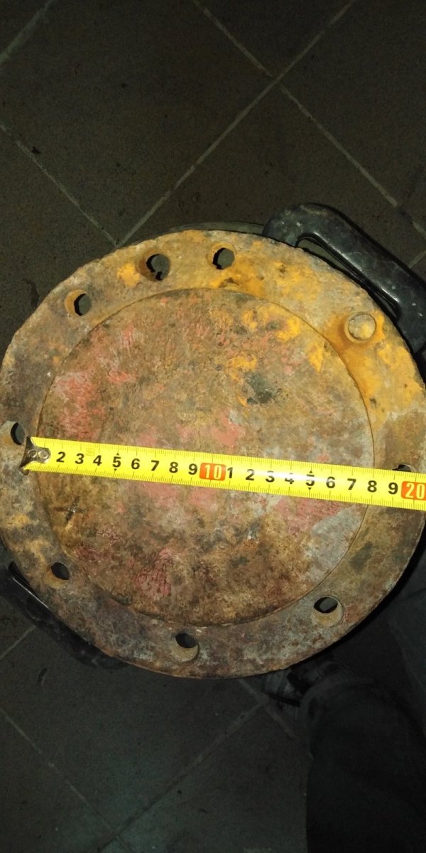 Добрый день. Уточнил товарищ размеры. Диаметр-25 см, вес- 10,5 кг, толщина 10 мм, восемь отверстий, девятое отверстие полевая доработка. Клейма на просматриваются.