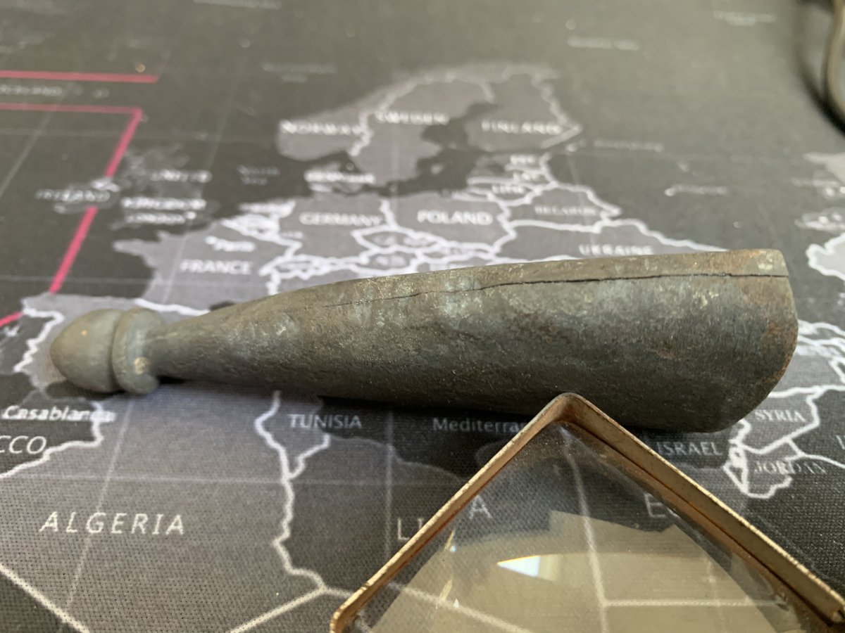 Есть клеймо 3ДБК 2Б 1, перевели как 3-й Дивизион Батарей К. 2-я Батарея. Оружие 1. Рядом есть ещё одно клеймо «7ка» и ещё что то, вроде тоже семь.