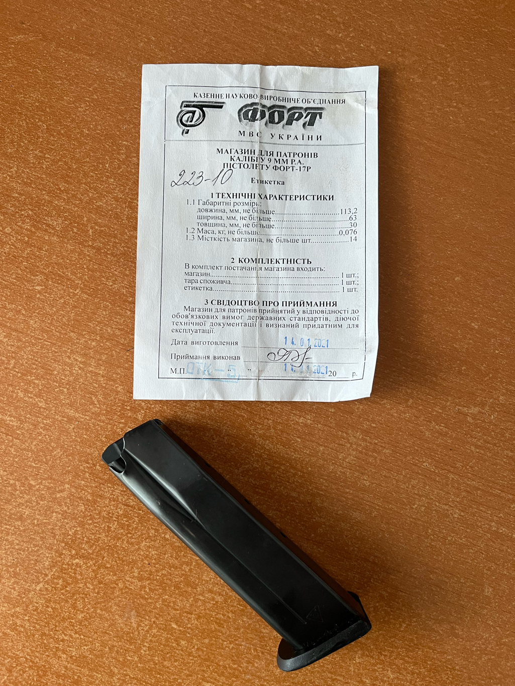 Мушка з оптоволокном червона Може бути встановлена на Форт-12,14,17,18 Висота: 6мм Мушка складається з металевого корпуса та оптоволокна червоного кольору Стан: нове Виробник: Weapon obsession Ціна 1500₴ Магазин до Форт-17р кал 9мм р.а. Модель 223-10 (стара версія) Стан: б/в, кілька разів використовував Ціна 1400₴
