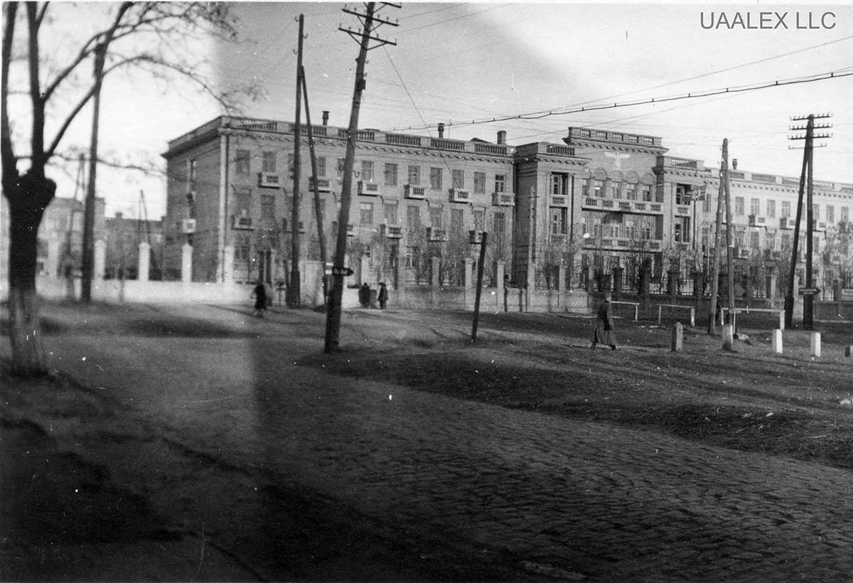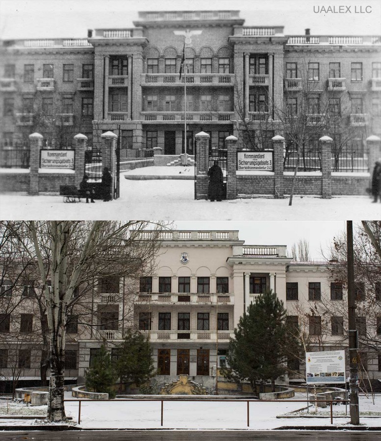 Фотографии Запорожской военной комендатуры во времена оккупации нацистскими войсками 1941-1942 годов. Располагалась она по адресу ул. Гоголя, 64 в теперешнем втором корпусе ЗНТУ. Гитлер на входе в комендатуру