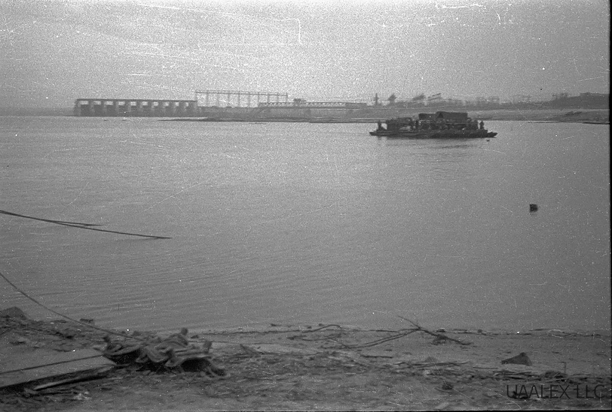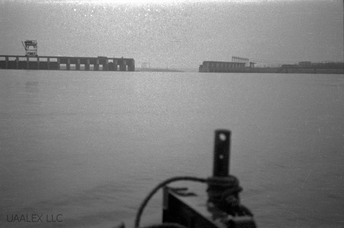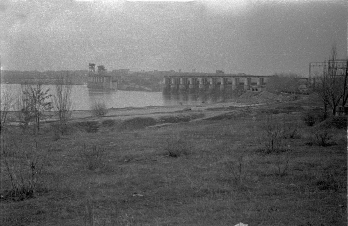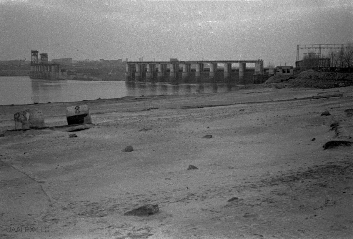Фотографии обмелевшего Днепра выше плотины ДнепроГЭС. Фотоснимки сделаны в 1942 году, после подрыва плотины в августе 1941 года. На этом фото видны каменные основания Кичкасского моста (уничтоженного в годы Гражданской войны) у острова Сагайдачного (до 2016 года остров назывался Ленина), а чуть правее — древнее русло Днепра «Гусиное горло».