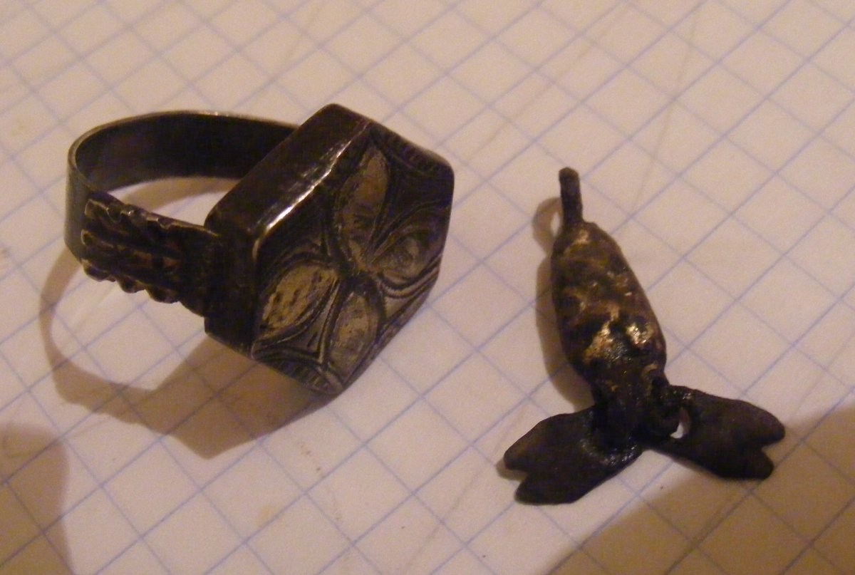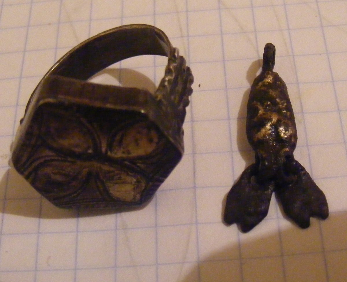 Добавлю трохи хабару. Перстень - симбіоз КР та середньовіччя. Вага - 4,48гр. Срібло, позолота. Підвіска - жабка. Срібло, позолота. Лапи - бронза.