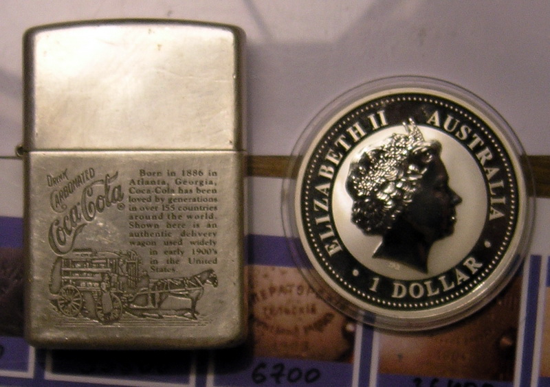 Оцените, плз. а то не моя тема. Зажигалка Зиппо, 1986года, юбилейная к 100ю кока колы корпус серебро, рабочая Монета в 1 австралийский доллар, тож серебро, 2007 год, на обратке свинья нарисована))