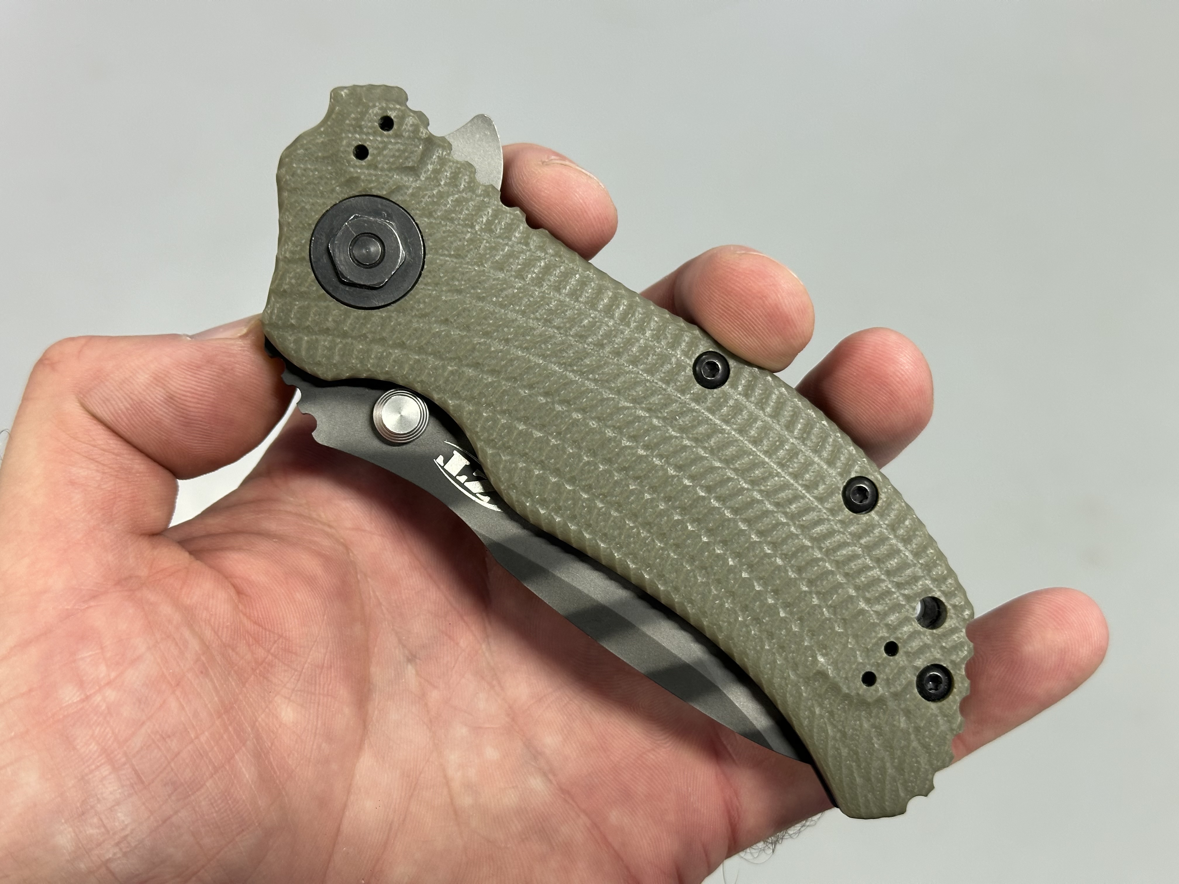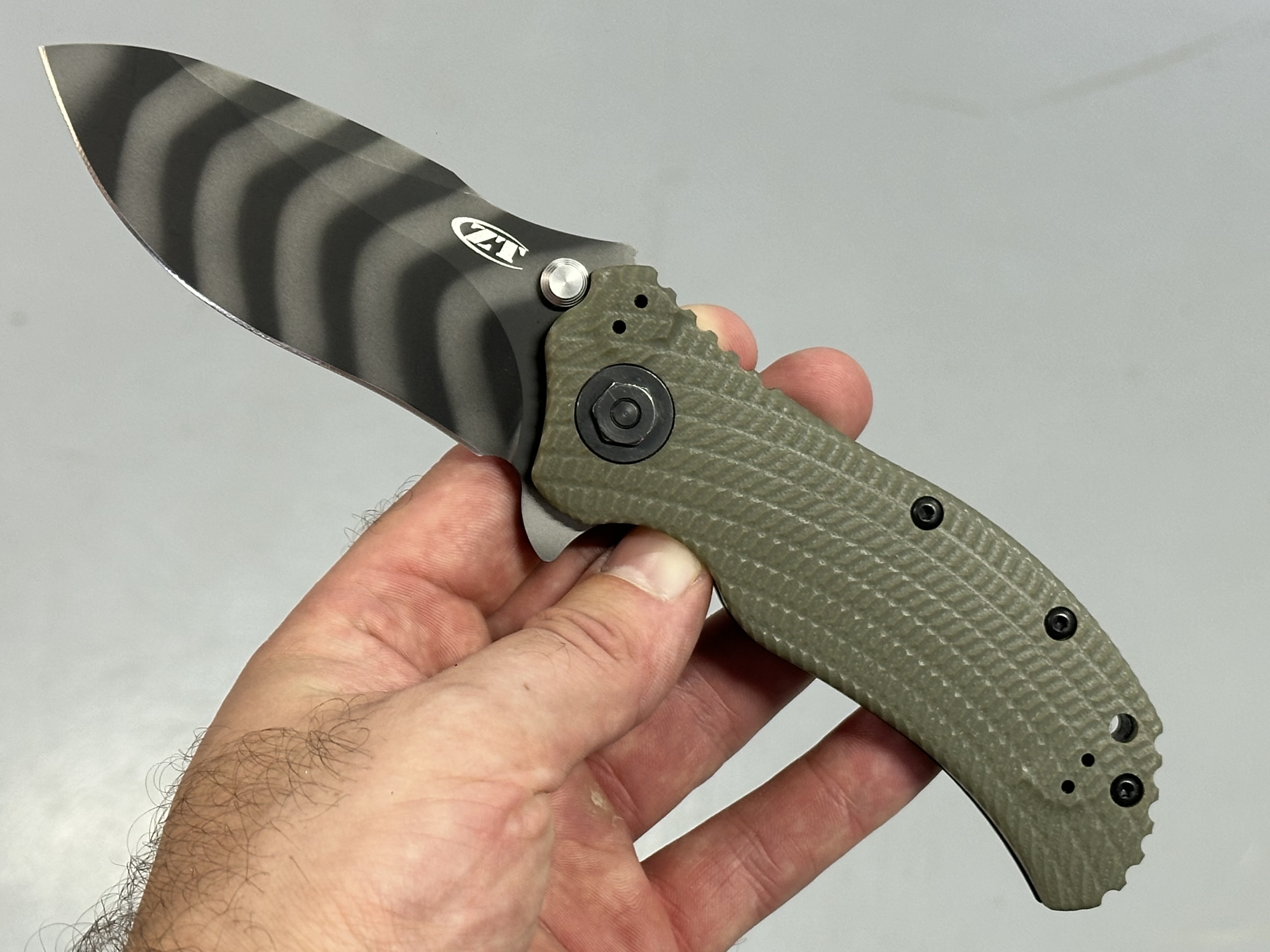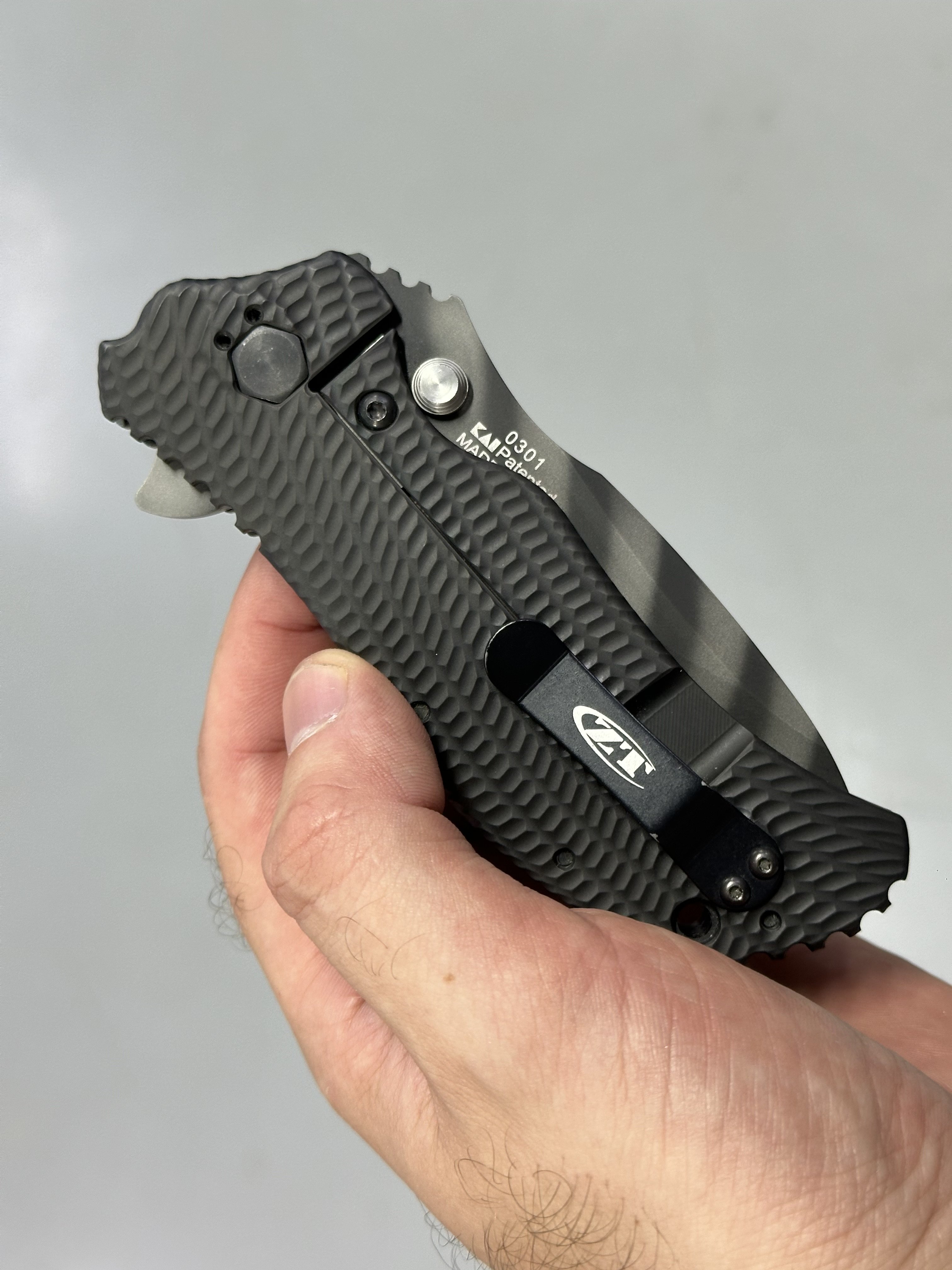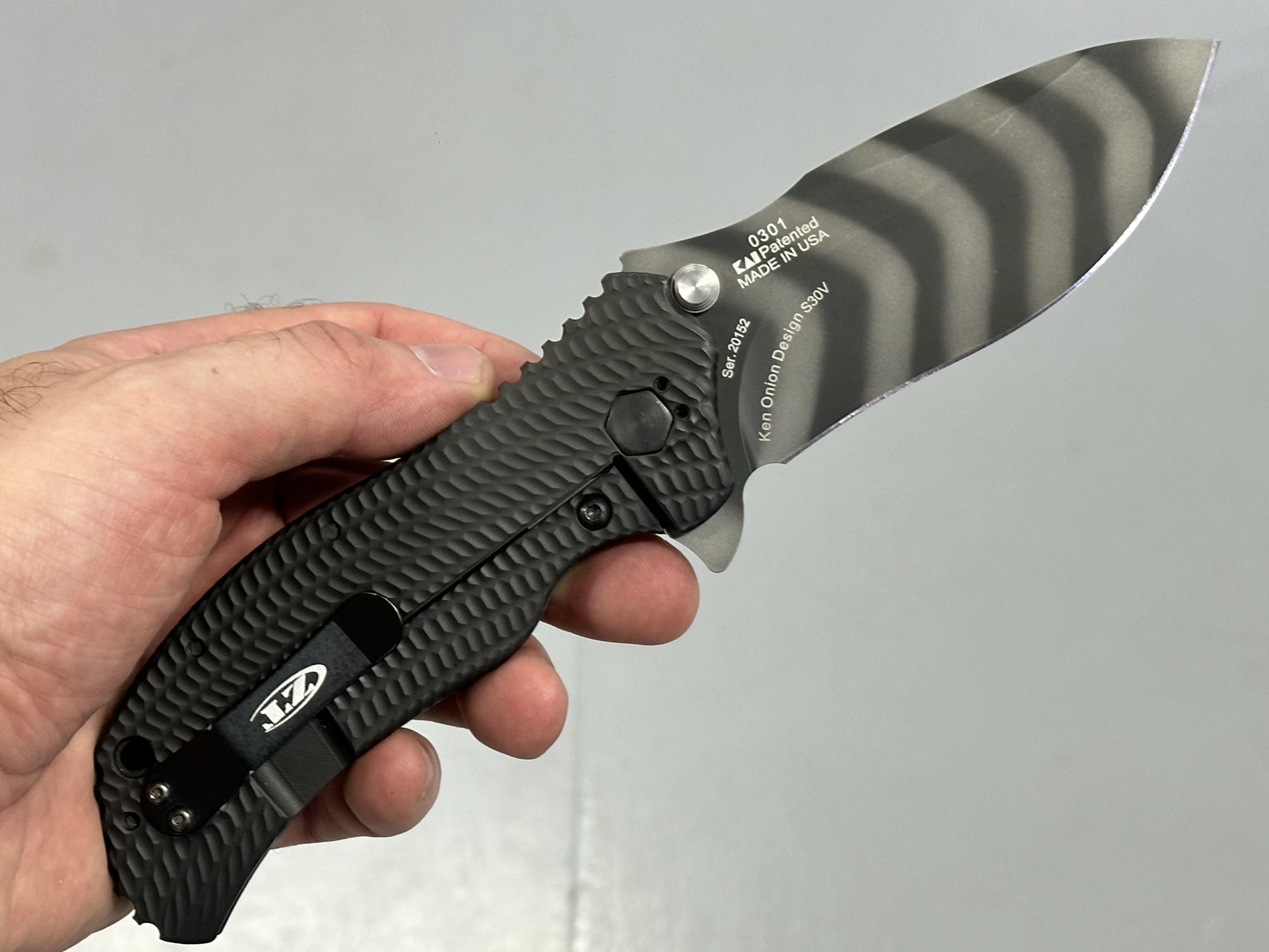 Еще более агрессивный, чем Zero Tolerance 200-ая модель, нож с характерной полосатой расцветкой клинка. Нержавеющая сталь S30V также покрыта карбидом вольфрама (Tungsten DLC). Зеленая рукоятка сделана из G-10, имеет титановую вставку замка FrameLock (модернизированный LinerLock). При открытии используется система SpeedSafe®, позволяющая открыть нож легким нажатием на выступ клинка (плавник).
