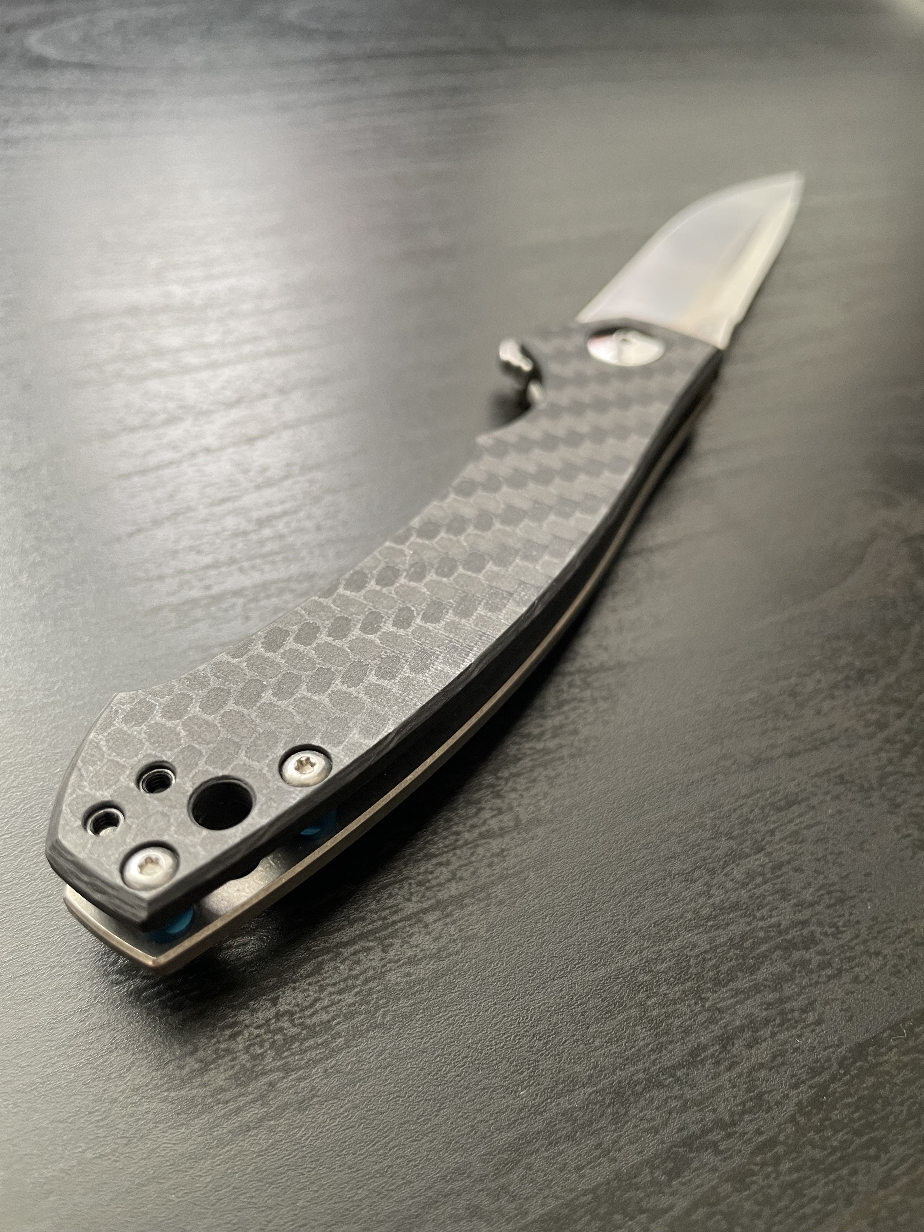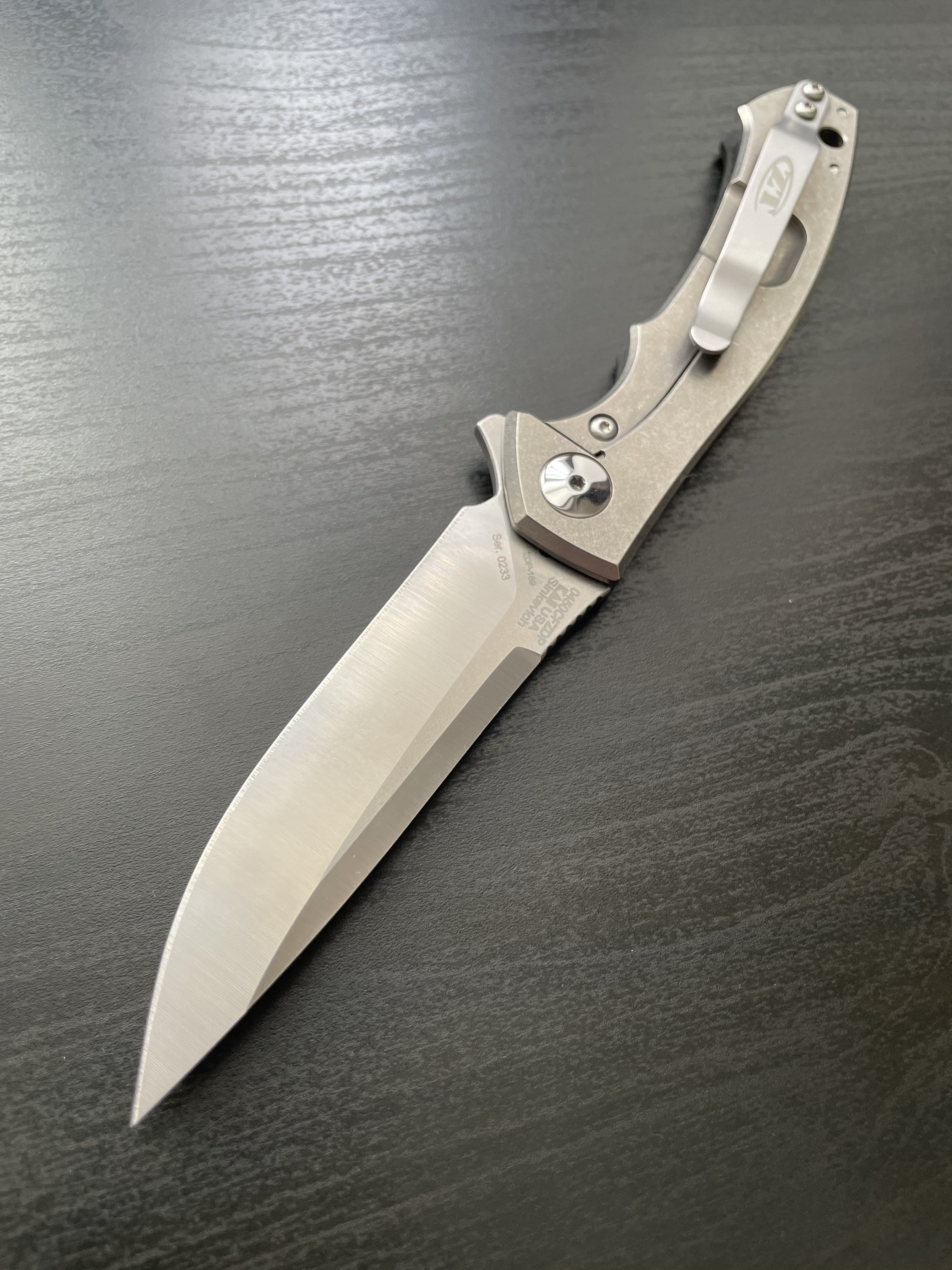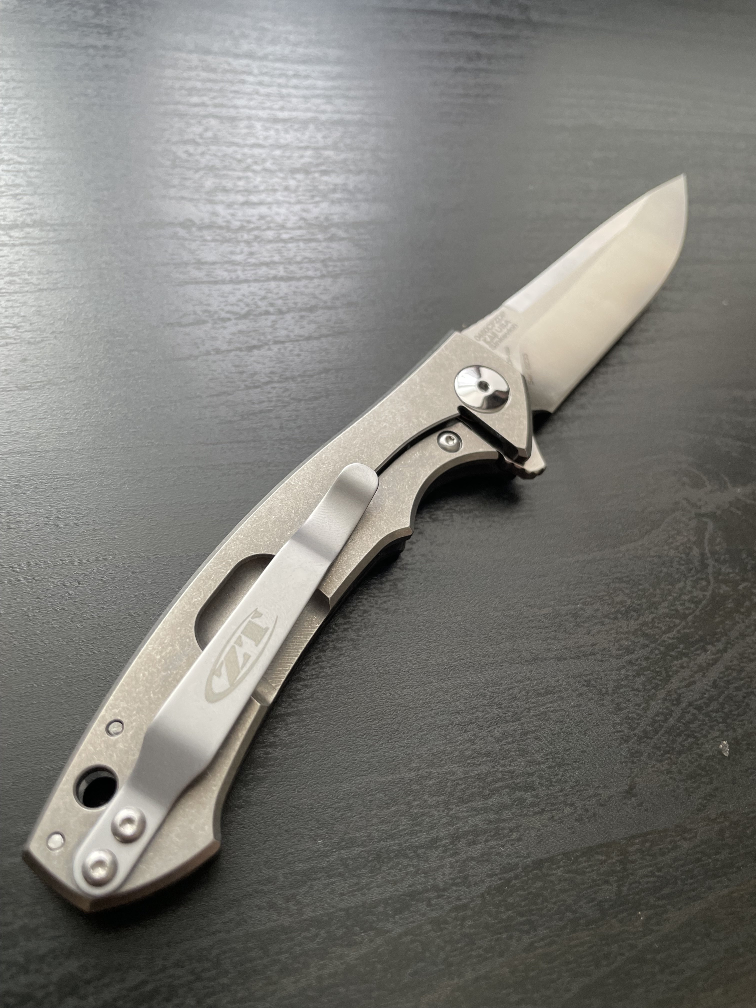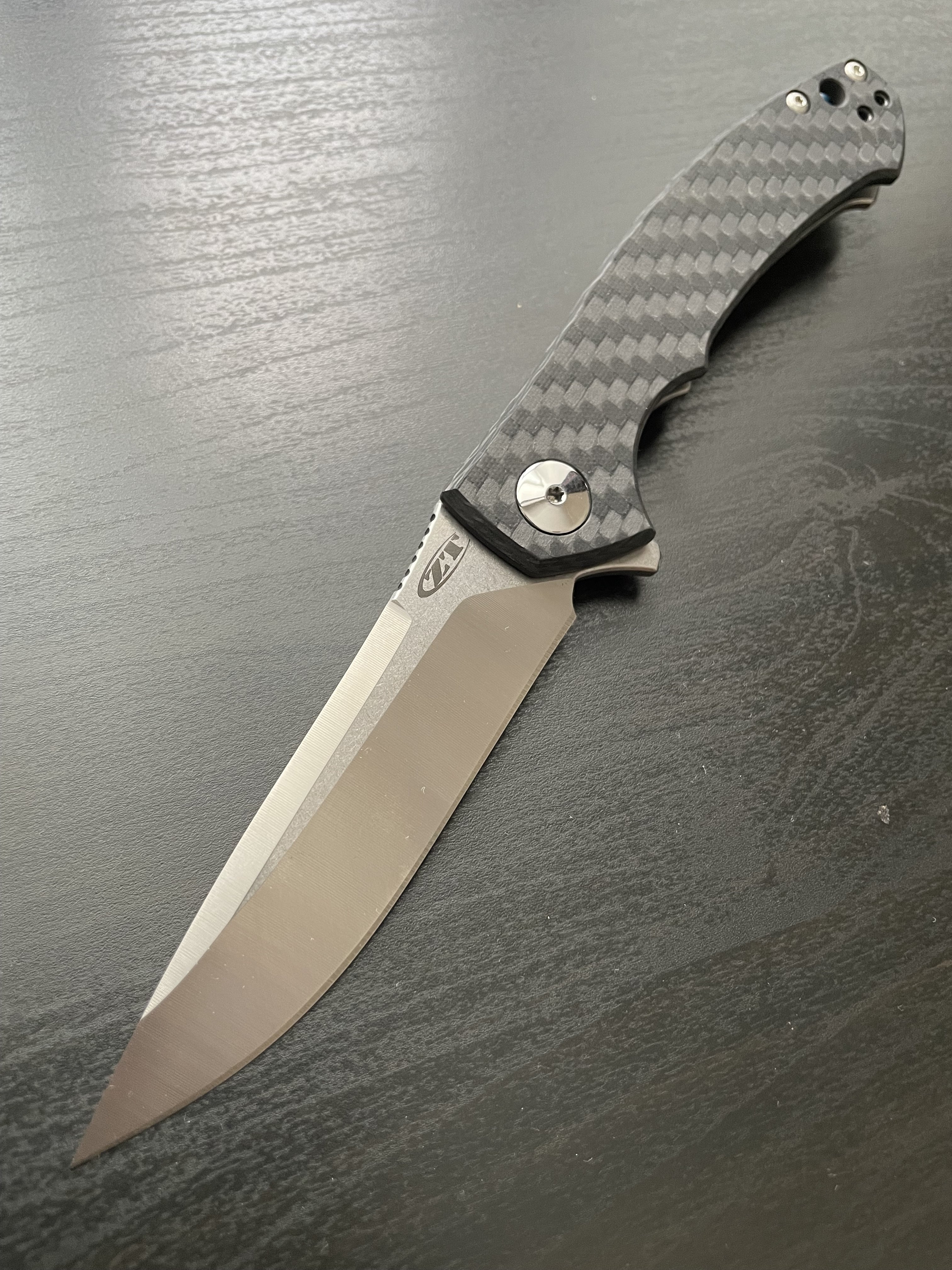 Zero Tolerance 0450CFZDP Ніж який майже неможливо знайти. ZDP-189 у поєднанні з якістю Zero Tolerance. Це майже Rockstead (ще й дешевше) Це зовсім не звичайний ніж від ZT: сталь ZDP-189, карбон на руків'ї, полірована фурнітура, сині акценти на бонках. Подібна фурнітура використовувалась у Factory Custom серії ножів ZT (там фурнітура повністю виконана SiDiS'ом він же Sinkevich - тут дуже схожа ситуація). Один із найкращих EDC ножів і окремий предмет для колекції. Safe queen. Mint. Повна комплектація Характеристики: Загальна довжина: 188 мм Довжина клинка: 83мм Товщина клинка: 3 мм Сталь: ZDP-189 Матеріал руків'я: Carbon Fiber Вага: 77 гр. Ціна: 480$