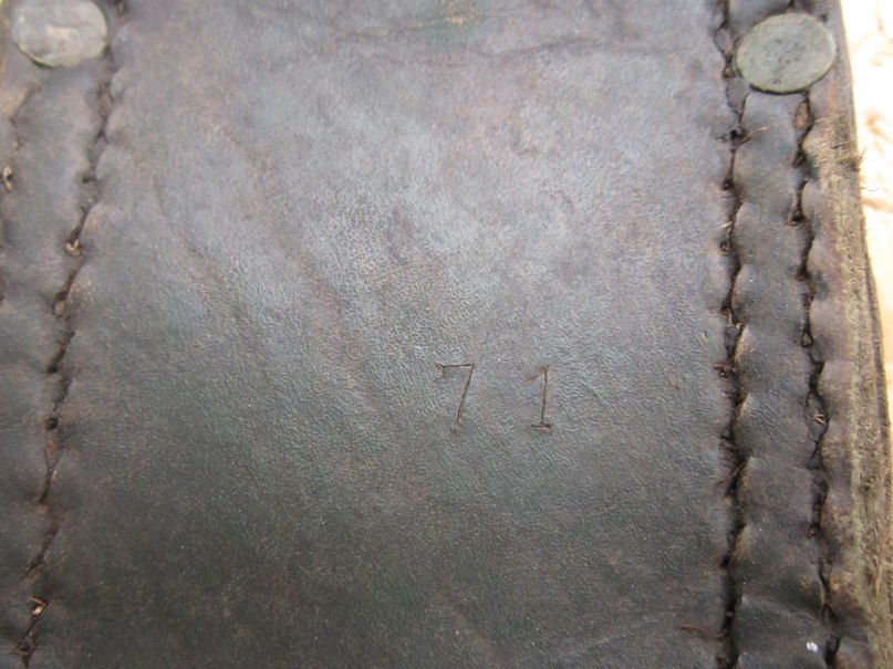 Была у меня похожая,так и не узнал чья,клейма немецкие,внутри под кольцом приклёпана мет пластина защитного цвета,были версии что из какого то тесака...