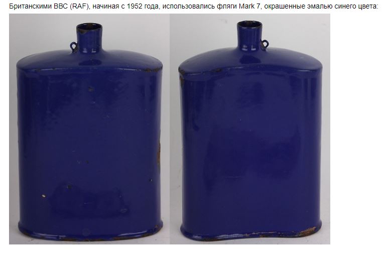 Є такий варіант: "Bottle, water, enamelled, Mark 7. Производство стальных эмалированных фляг с корковой пробкой продолжалось и после Второй мировой войны, до начала 1950-х годов. Нумерация моделей фляг в этот период была изменена с римской на арабскую."