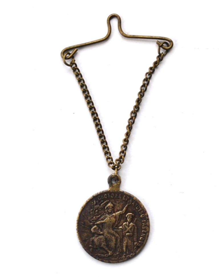 Доброго дня! Один из многих патриотических жетонов того времени. Носили как на цепочке так и с бантом/лентой триколора.