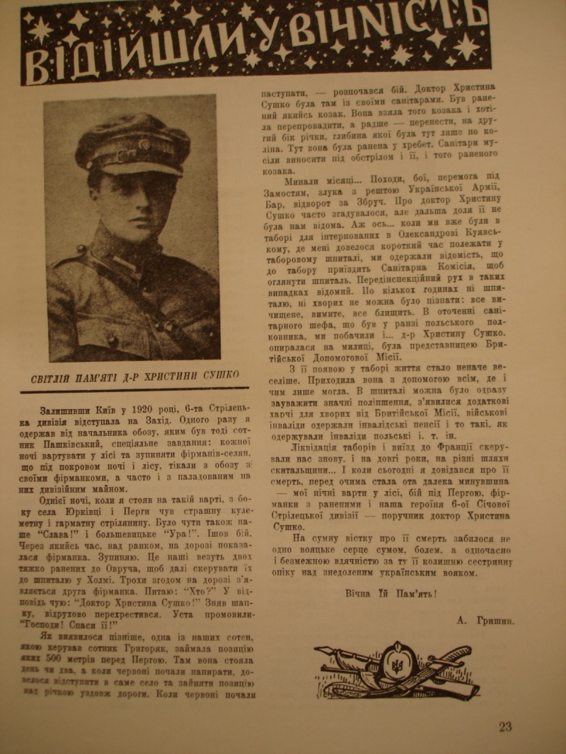 Христина Сушко (княгиня Трубецька-Долгорука) – санітарний поручник 6-ї Січової дивізії Армії УНР, перша жінка-офіцер армії УНР, голова правління Щипіорнівської філії Української спілки військових інвалідів, член проводу Союзу українок. “Д-р Христина Сушко”. Нарис поета й одного із засновників Центральної ради Миколи Вороного, з книги Романа Коваля «Батькам скажеш, що був чесний». Христина Сушко — ім’я це широкому світові незнане; про нього не сурмили у дзвінкі сурми герольди, не розголошували його в панегіричних статтях військові кореспонденти... Гнані мачухою-долею, забуті цілим світом, ми б’ємося за своє національно-державне істнування самотужки, своїми власними силами і не маємо ні часу, ні спромоги дбати про гучний розголос наших героїчних змагань; та це нас мало і обходить. Як давні спартанці в Термопільській дефіляді, військо наше б’ється до останньої снаги, певне своєї ідеї, пам’ятаючи заповідане предками-запорожцями гасло: “Чи добути, чи й дома не бути!” Де вже нам дбати про окремі одиниці, про вихвалення наших лицарів-героїв! А похвалитись могли б дечим і ми... От хоч би і цим ім’ям, що виписане в титулі цеї замітки. Ім’я це належить високій істоті з незвичайною силою духа, жінці-героїні, якою має право пишатись ціла нація. В Давній Греції таку людину ми на привселюднім святі увінчали б лаврами, тепер у инших державно визнаних народів таких людей нагороджують орденом “Virtuti Militari”, у нас... Невеличке коло наших читачів довідалося про Христину Сушко лише з уміщеної в VI числі нашої часописі резолюції Головного Отамана на рапорті Начальника Військової Місії у Варшаві про видачу лікарю Сушко грошової допомоги на курортне лікування. В згаданій резолюції було виразно підкреслено, що в боротьбі за українську незалежність пані Сушко визначилася "цілковитою відданістю справі і визначним героїзмом”, а тому грошова допомога на її лікування є лише "реалізацією обов'язку держави і її влади до одної з кращих дочок її". Здається, цілком виразно і ясно. Але як і в давню давнину лаври Аристида не давали спати: Темистоклю, а поруч з великим Патроклем жив і робив свої каверзи огидливий Терсіт, так і у нас... не обійшлось без нашептів і заздрих пересудів. Що то, мовляв, за визначний героїзм могла проявити "жінка-лікарь”, і чому, власне, їй видається грошова допомога на лікування в якімсь "курорті”, коли і т. д. Отже, для вияснення цього болючого непорозуміння і для висвітлення героїчної постаті пані Сушко я подаю тут ті коротенькі відомости, які вдалось мені зібрати з певних військових джерел і від самої пані Сушко у Варшаві.Христина Скачківська, жінка бригадіра N-ської (командира 6-ї бригади) Стрілецької дивізії Романа Сушка, родилась на Північному Кавказі, в Сочі, що лежить при березі Чорного моря. Далі якийсь час жила на Україні, а потім для здобуття вищої освіти вдалась за кордон, де, власне в Льозанні, скінчила на медичному відділі університет, одержавши учену степінь доктора медицини. Пізніш для визнання прав лікаря в Росії зложила іспити при Військовій академії в Петербурзі. Вибухла війна і революція. Вірна дочка українського народу і щира патріотка свого краю Христина Скачківська на початку 1918 року вступила до українського війська яко культурно-освітний старшина і полковий лікарь і з того часу весь свій хист, знання і високі почуття 