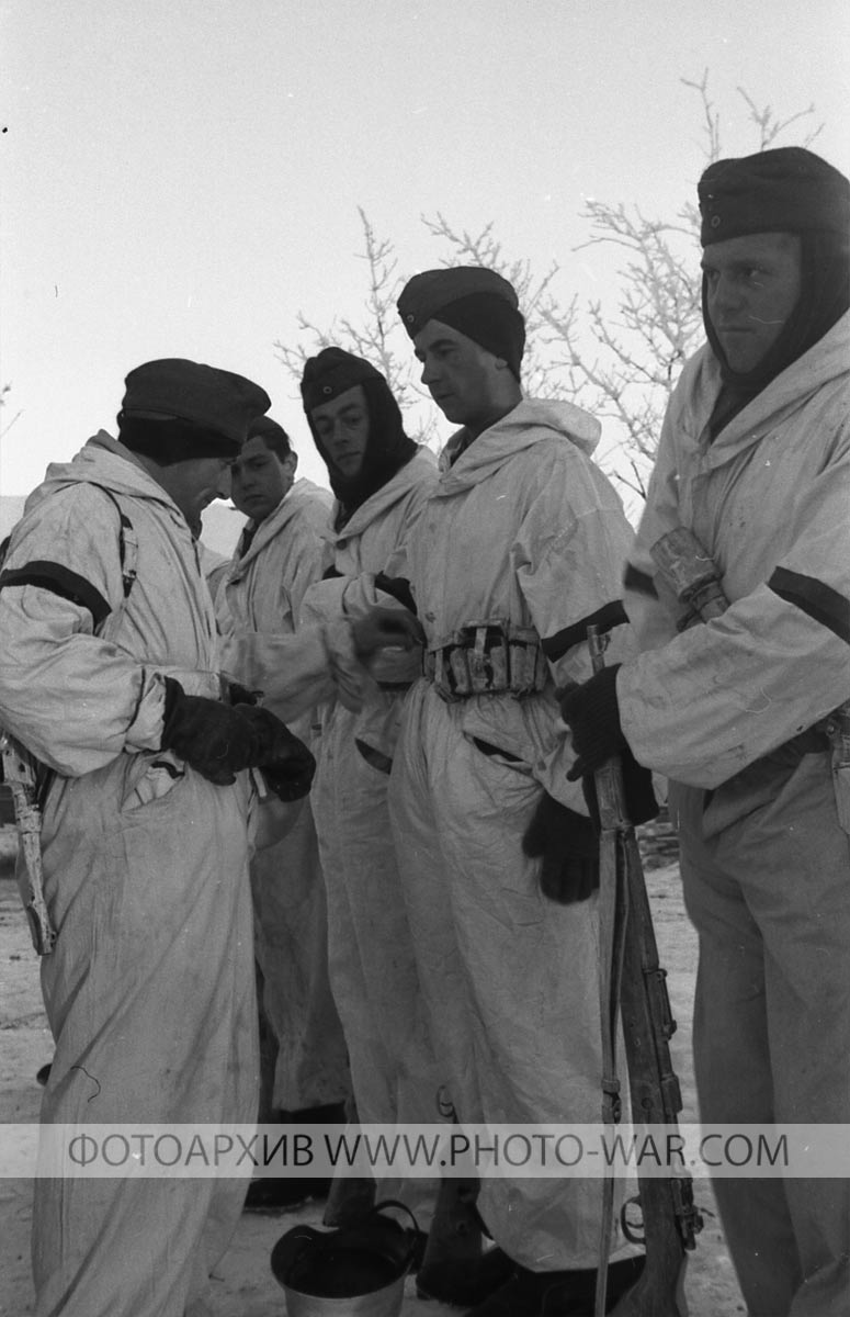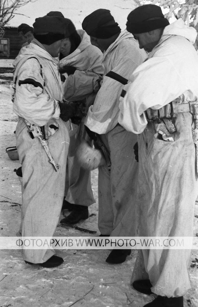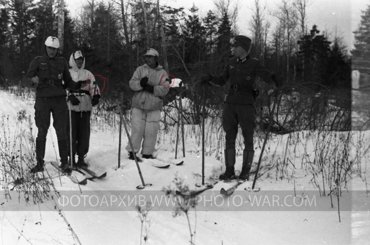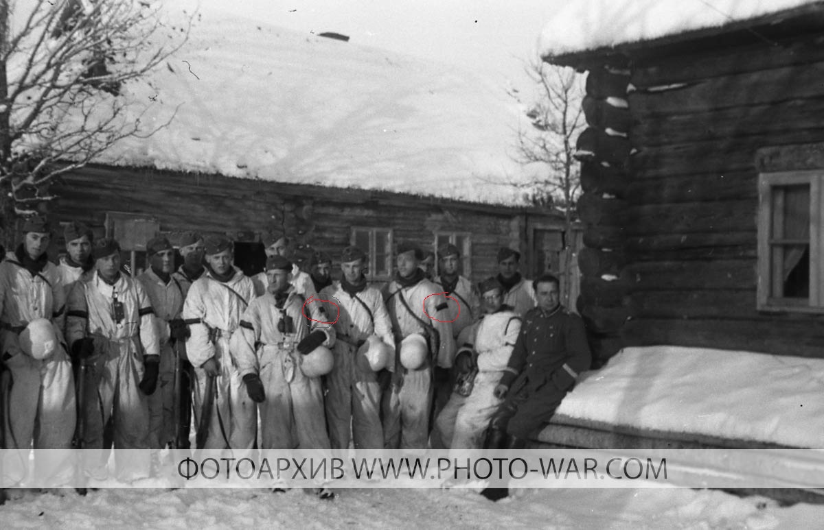 На шинели - погоны. (у СС еще нарукавный орел). Петлицы не шились. На парки - только опознавательная лента. Погоны и орлы - не полагались. Из неуставщины видел пришиты погоны к парке (кстати опять таки в ГД) и полоски-звания, которые полагались на камуфлированную форму. Но это исключения из правил. Опознавательные ленты как правило были "уставные" - но встречаются фото и самодельных лент. На маскхалатах ленты не пристегивались, а пришивались. Есть версия что полоска вообще была прокрашена краской). По крайней мере на фотографиях не видно никаких следов пуговиц... Соответственно, это ставит под сомнение то, что ленты были разных цветов и использовались как пароли. Скорее всего цвет был один - красный. И пароль был примитивный - "лента есть - свой, нету ленты чужой". Это и подтверждает косвенно фотография с "гадами" из ГД... Лент не было - прилепили погоны. Они не так демаскируют, как цветная лента, а вблизи немецкий погон спутать с чем то трудно... PS Кстати очень интересный момент. Частенько попадаются парки без капюшонов... Видимо солдаты самостоятельно обрезали их чтобы не мешались...