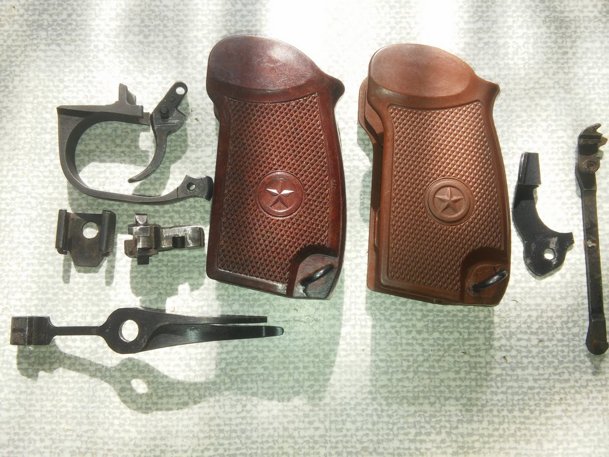 Всем доброго. Продам зип на ПМ лёгкое б/у слева на фото, всё с рабочего ПМ это скоба, спусковой крюк, задвижка боевой пружины, боевая пружина, курок, абсолютно новая бакелитовая рукоять. А справа, резаная затворная задержка, спусковая тяга рабочая, но имеется небольшое отверстие по середине, на работоспособность не влияет, затворная задержка зуб спилен и пластиковая рукоятка. За всё 500 гр. Ко Всем с Уважением.