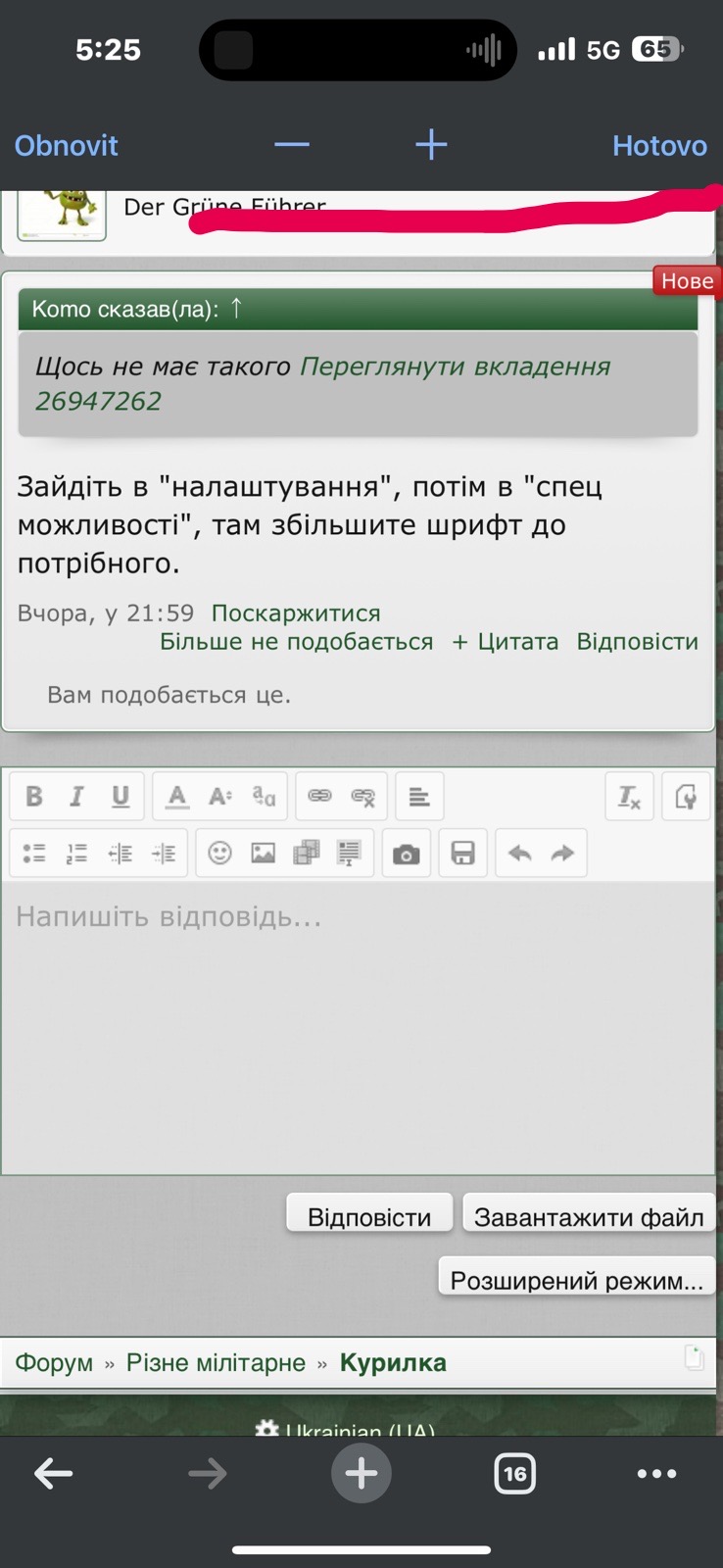 Усім вітання. Ніяк не можу збільшити шрифт, щоб легше читати повідомлення на форумі. На самому мобільному, в настройках, зробив шрифт великим, але заходу на форум а він таким маленьким залишається, очі виїдає. Хто знає як його тут в настройках змінити? Бо шукаю, шукаю і ніде не зміг найти.