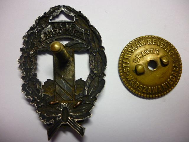 Орлик має бути, він кріпився приблизно ось так Закрутка у Вас від іншого знаку, ці знаки виробляв лише Станіслав Рейзінг, усього випущено кілька тисяч. Але у будь-якому випадку, гарна знахідка, вітаю. Straż Graniczna – odznaka występująca tylko w wykonaniu Reisinga, wykonywana również w srebrze. Ilość odznak zdecydowanie mniejsza, kilka tysięcy sztuk. Ceny zaczynają się w okolicy 1 tysiąca pln. Bardzo rzadkie są miniatury, częściej spotykane są legitymacje odznak.