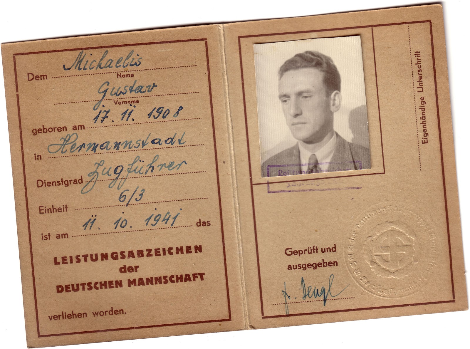 Доброго! По ходу, схоже, можливо, воно. Deutsche Mannschaft der Volksgruppe in Rumänien (організація румунських фольксдойче). https://ailsby-collection.blogspot.com/2012/06/military-sports-badge-of-romanian.html?m=1 На документі центральний медальйон відтиску печатки ідентичний. З повагою,