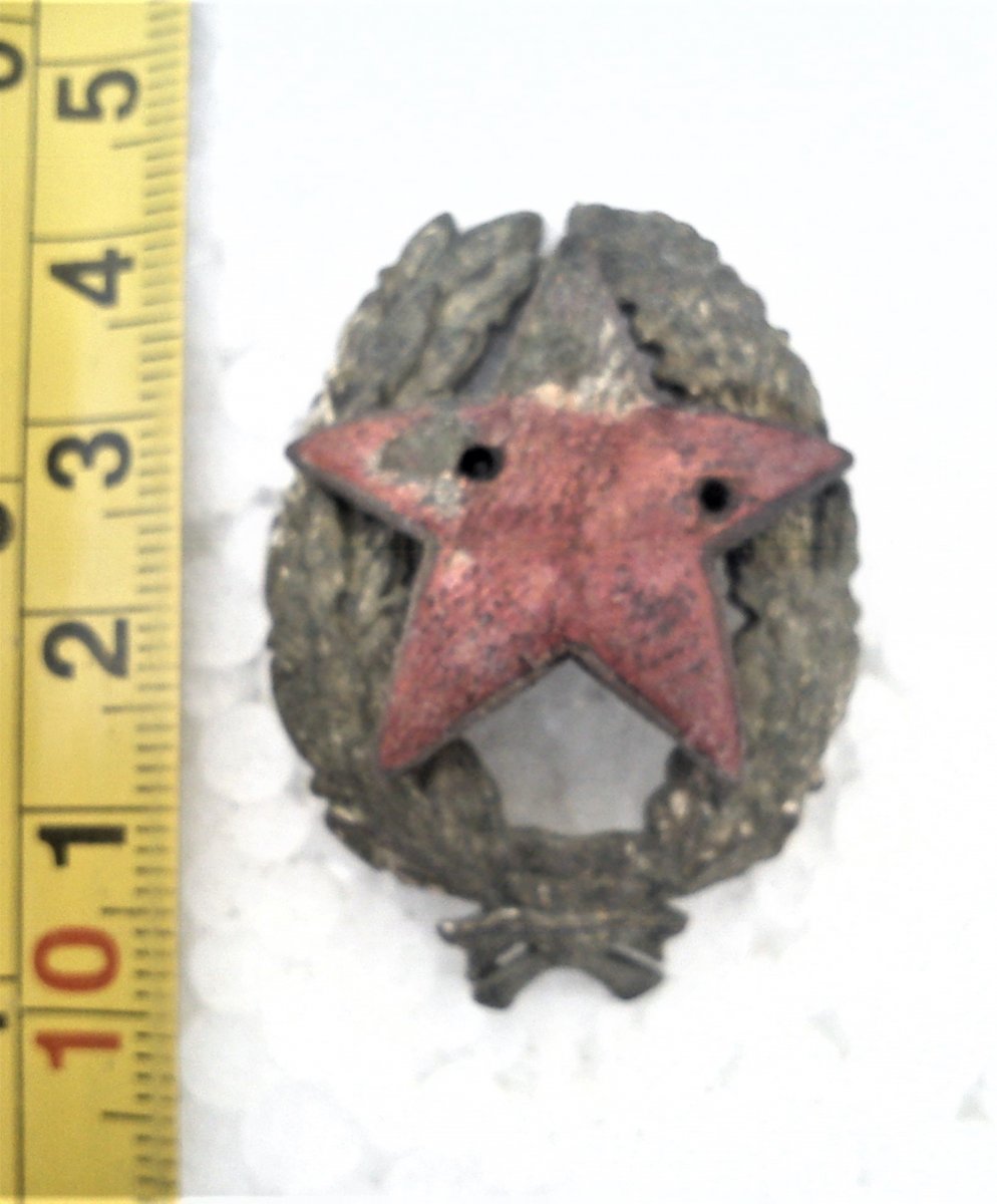 плуг и молот утеряны так же винт и гайка.еще кламера на звезде сквозные (таких не встречал...) обломано ухо на венке - но денег должен стоить... (здесь оценка запрещена). будет в продаже дайте знать. А венки на них были и царские ломали короныс них - и были свои РККА