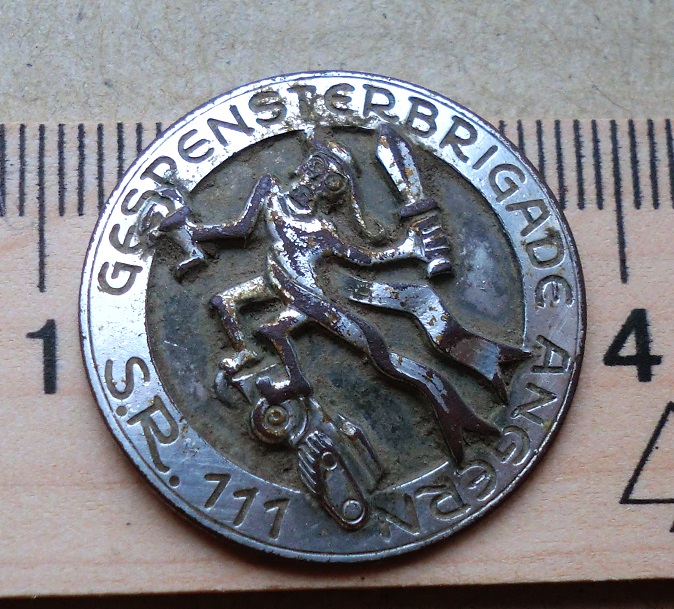 Это полковой знак 111-ого стрелкового полка. Полковник Гюнтер Ангерн был командиром 11-й стрелковой бригады с 4 декабря 1939 г. по 1 августа 1940 г., в которую входили 110-й и 111-й стрелковые полки. Это традиционный значок одного из 2-х этих полков. После 1-ого августа 1940 года Ангерн больше не отвечал за эту 11-ю стрелковую бригаду, поэтому значок был очевидно вручен во время его пребывания на посту бригадного фюрера, так как он еще содержит его имя. Gespensterbrigade, бригада привидений. S.R.111, Schützenregiment 111, 111-й стрелковый полк. Во время французкой компании в 1940 г. 11-я стрелковая бригада неожиданно возникла как привидение в тылу французских войск и выиграла бой. С тех пор ее так и называли-бригадой привидений. https://ru.wikipedia.org/wiki/Ангерн,_Гюнтер
