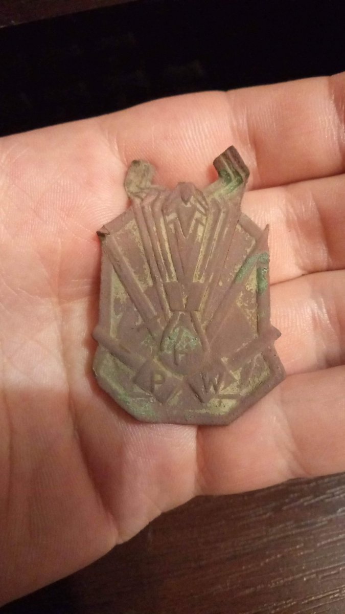 Доброго! Предположу, что один из многочисленных знаков Przysposobienia Wojskowego (https://pl.wikipedia.org/wiki/Przysposobienie_Wojskowe#cite_note-1), Польша межвоенная (1927-1939). Организация занималась допризывной подготовкой молодежи, аналог Осоавиахима/ДОСААФ. Были знаки курсов, лагерей, отделов военной подготовки лесников, железнодорожников, земледельцев, почтальонов, конной подготовки и т.п. https://www.google.com/search?biw=1....0....1..gws-wiz-img.......0i7i30.135Y-3q8vlE Поляки сами иногда с определением иногда затрудняются. Первая буква, скорее всего, означает название территориального отдела,школы, курса или лагеря (попробуйте посмотреть в районе находки населенные пункты, которые подходят по названию на тот период). С уважением,