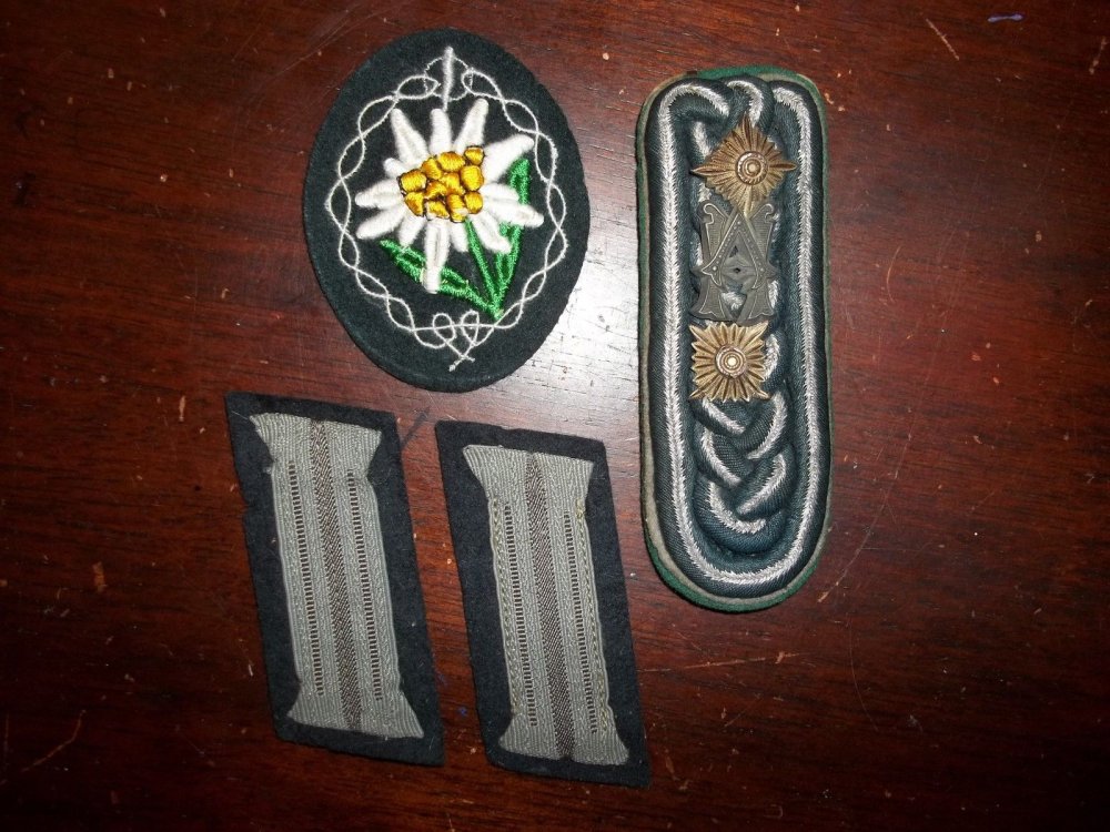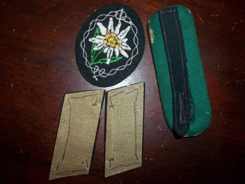 Это погон военного чиновника в ранге гауптмана, с интендантской шифровкой. То есть заведовал снабжением. Оригинал. По цветку не скажу. Петлицы общевойсковые -подложка самодельная.