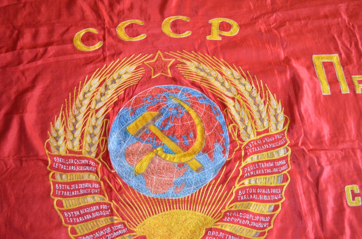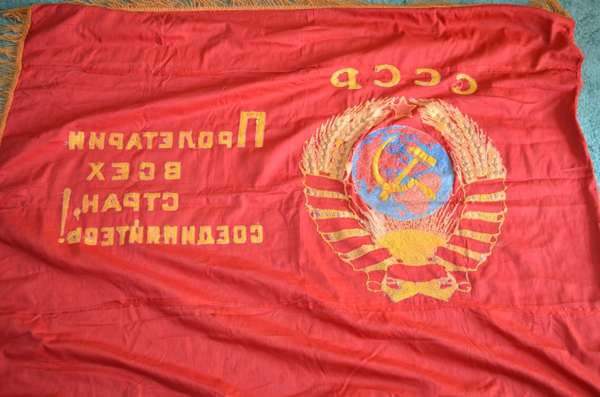 Всем здравия желаю! Друзья есть вот такой довоенный флаг образца 1934-1939 года! На гербе 10 лент 10 республик. Оригинал 100 % ! Шитье на кумаче! Состояние хорошее но есть ньюанс нет тыльной задней стороны.. Он хоть и был односторонний задняя сторона просто чистое поле но все же.. Будет ли интерес если выставить на торги . Спасибо! С Ув!
