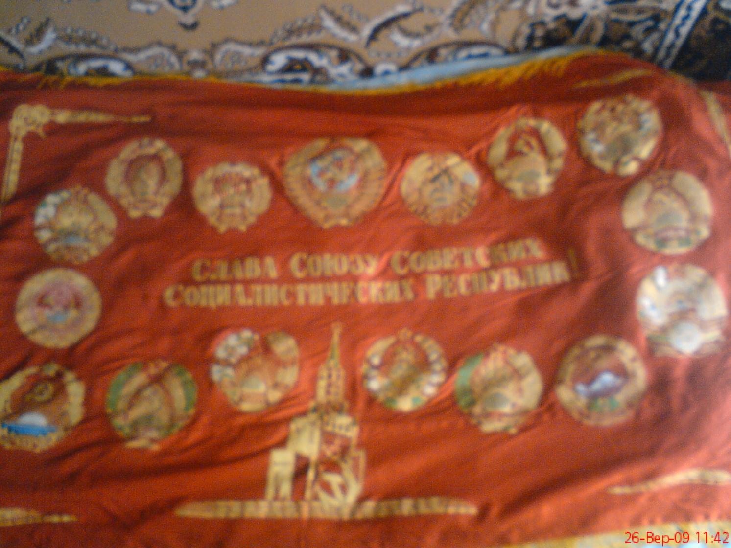 Продавати не буду, але всеодно цікавить вартість переходящого знамені переможцю соц.змагання. Досить цікава зворотня сторона : всі герби республік СРСР, хоч геральдику СРСР по ньому вивчай.