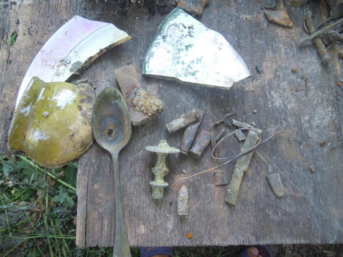 знаменний заплив. Переддень народженням сина фото 62. загальний вигляд 1 зміни фото 63. біла скляна бусина+3 гудзика+патрон 9мм+гільза 7,92+залишки карманного годинника фото 64. загальний вигляд 2 зміни фото 65-69. цікавий черевик на новому домі з пиляного камня. Підскажіть його приналежність!!!! Особливості: високе голенище + акулячий ніс+шкіряна підошва+два шипа на підошві+останні 4 люверси у вигляді крючків фото 70. залишки глечику фото 71-73. дві пляшки від мінералки м. Пятигорск. Що цікаво, лежали разом біля стіни будинку, в одній були залишки якогось палива(фантазія намалювала коктейль Молотова) фото 74. з тієї ж нової хати предмети по війні фото 75-76. деталь від кулемету МГ фото 77. також здається від МГ фото 78. Багор фото 79. фаянс і фарфор фото 80.Кузнецов в Будах