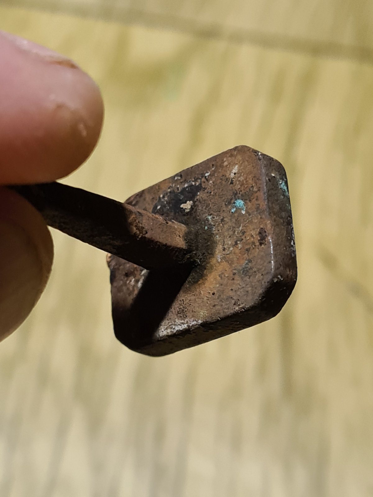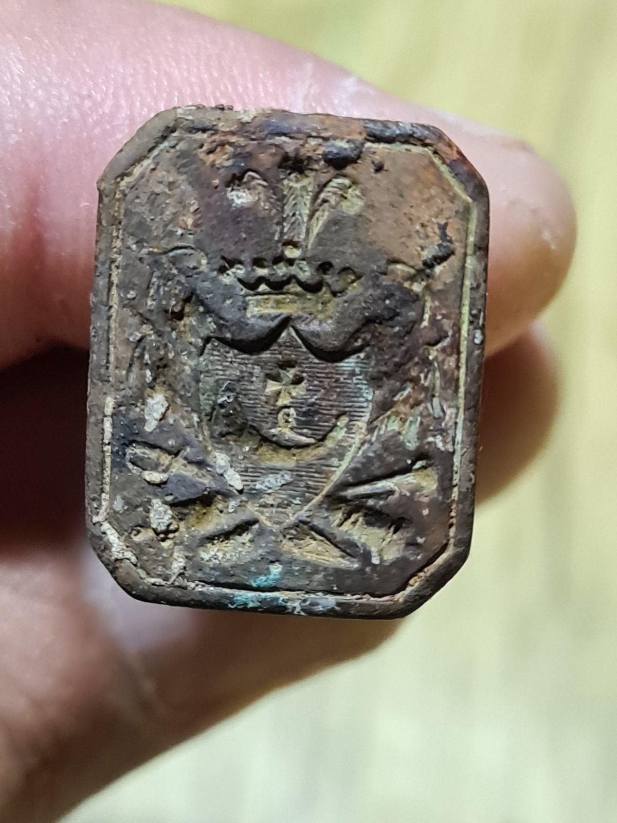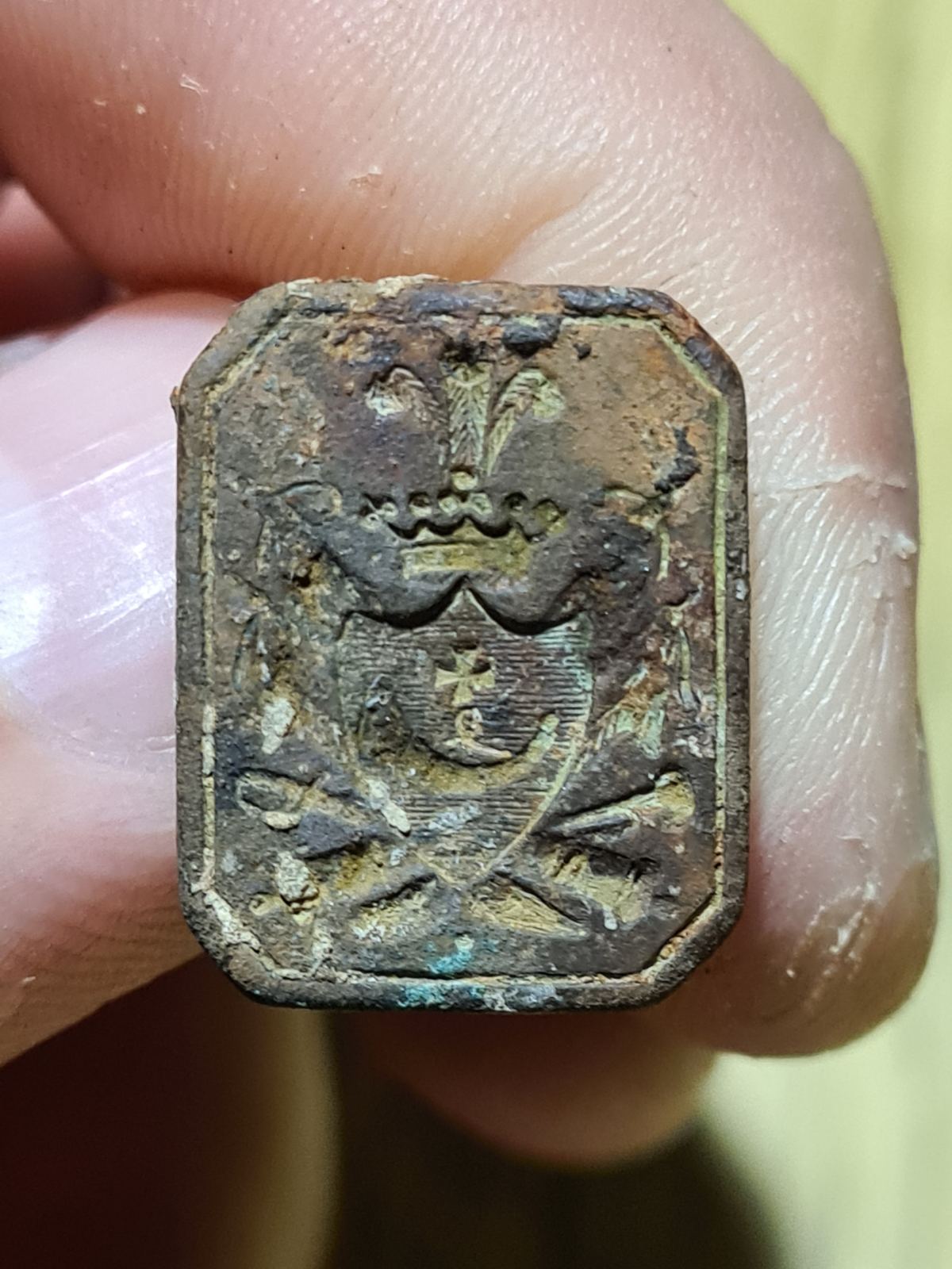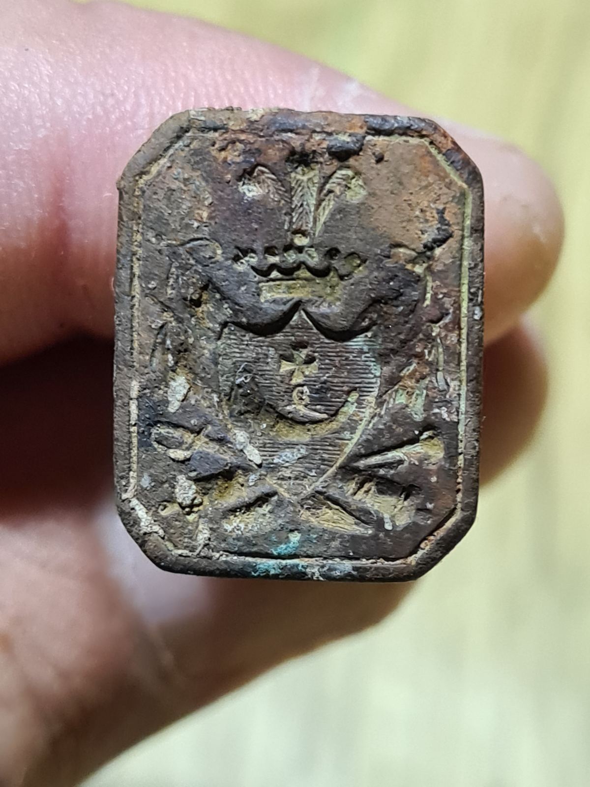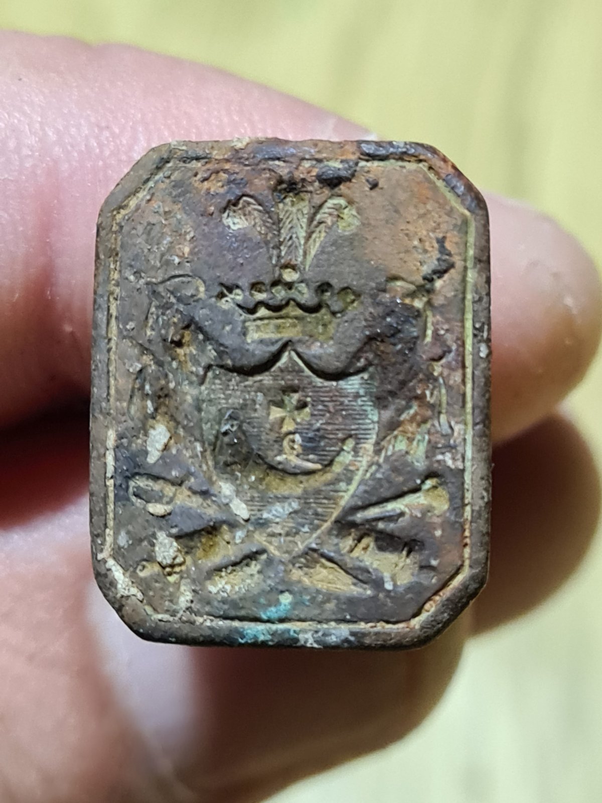 Найдено на дне. Кто подскажет, что за печать? Для сургуча? Гугл не помог. Просматриваются пушки, сабля, пороховница, бунчук, крест - как я понимаю, козацкие атрибуты, но в то же время корона, перья, щит...И какая правильная ручка будет на эту печать?