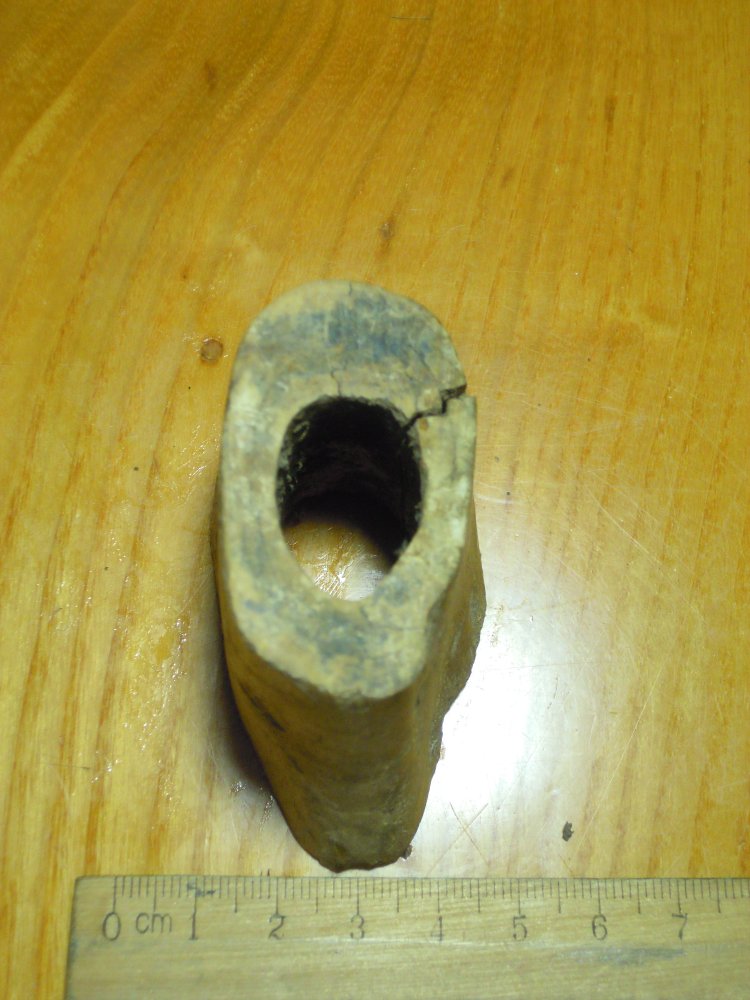 Ось така штука з кістки муляла мені очі декілька запливів. Думав звичайна кістка, але здивувало рівні края. Дістав з води, висушив, і помітив, що по краям є сліди механічний обробки!!! Покрутив у руках, перша думка - частина рукоятки холодної зброї, або ручка від чогось. Що скажете по цій знахідці? В руці сидить нормально!