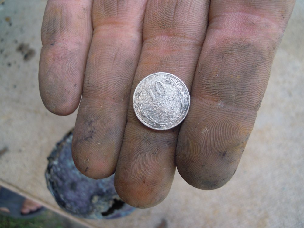 несподівані знахідки: 1. ручка краника самовару 2. срібні 10 коп. 1927 року 3. кружка з цікавим клеймом(підскажіть чиїх?)