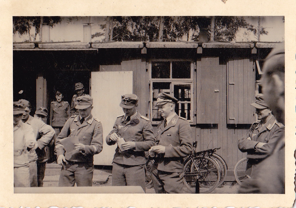 Слева: два рядовых, третий неизвестно, четвертый (дальний план в дверях) Unteroffizier рядом Feldwebel c Schützenschnur der Flakartillerie, Oberfeldwebel на должности Hauptfeldwebel на руковах Kolbenringe он же Шписс он же "Mutter der Kompanie", Leutnant der Flakartillerie, Hauptmann, Stabsfeldwebel... У Hauptmann похоже что (Allgemeines) Sturmabzeichen....? как у этого Hauptmann-а...