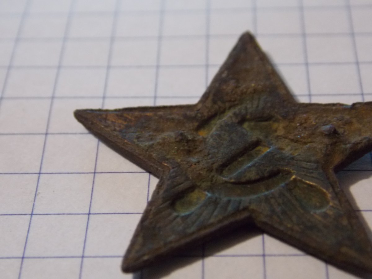 Доброго времени суток!Прошу подсказать от чего звезда,размер 32мм.,материал латунь или бронза.Думаю кокарда но смущает крепления были по бокам а не по центру.